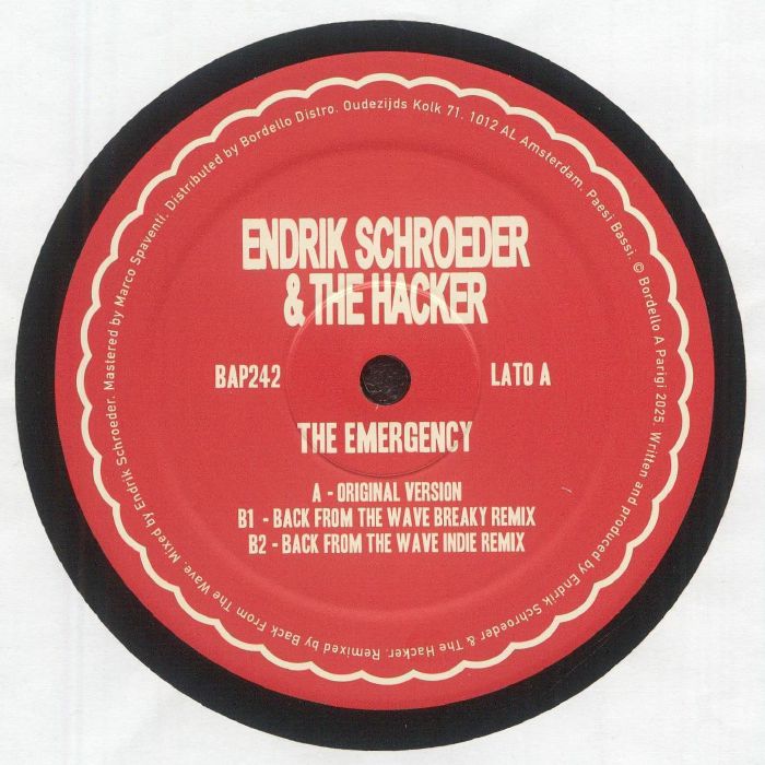 For the first time, Endrik Schroeder and The Hacker have joined forces. Their unique sounds and styles have combined seamlessly to produce a 12” that draws on their own musical histories. The title track pulls the listener into a darkened sweaty basement, a space where neon lights leer and quivering speakers vibrate. Melting elements of new beat and rave revelry, the track is bawdy and bold. Robotic samples cut through siren blasts, clean snare rolls skidding in thick basslines and creamy breaks. Two remixes follow, both care of fellow French producer: Back From The Wave. First up is the “Breaky Remix”. Adhering to the club origins of the source material, this remake sends melodies ever higher as drums lift elated lines to the stern refrain of “Emergency”. The “Indie Remix” closes. The glowsticks are sheathed in this version, instead it is the soaring keys that are given the limelight with beats bolstered for extra bite. Three tracks set to delight and ignite dancefloors.